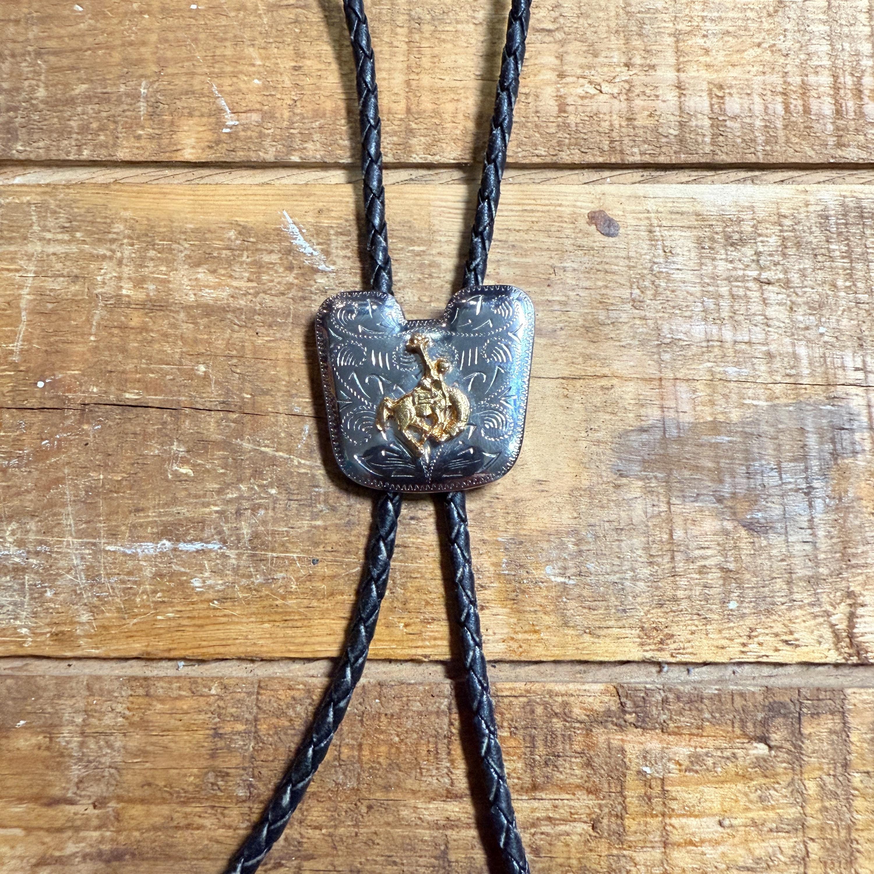 Vintage Bolo Tie featuring a Golden Cowboy on a Silver shiny backing. Made of Metal. Nicely detailed Cowboy. Dress it up or wear it casual. The bolo cord is braided black leather, with metal tips. Classic slide adjustment in back.